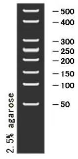 8 条带分为 50,100,150,200,250,300,400,500bp,其中 250bp 为 20ng/μl,其余条带 10ng/μl。
