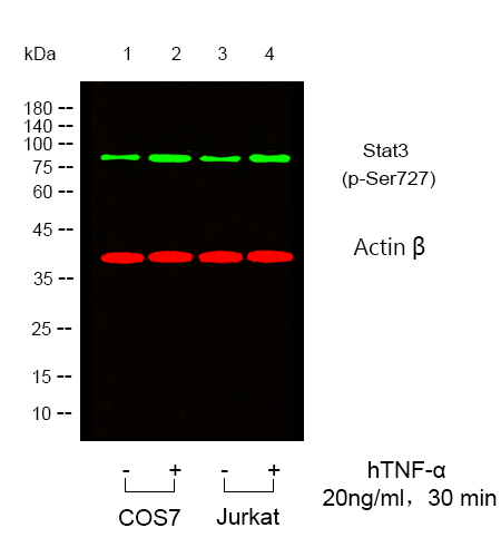特异性Phospho-Stat3 (S727) Polyclonal Antibody detects endogenous levels of Stat3 protein only when phosphorylated at S727.
