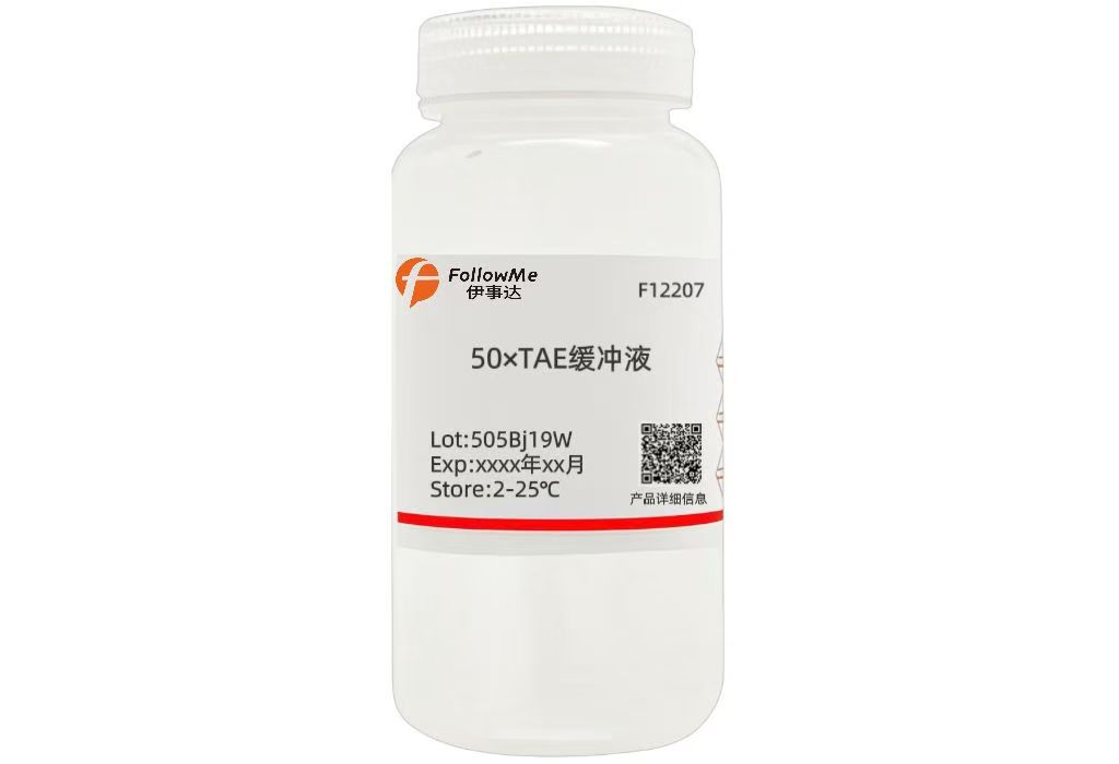 产品简介50×TAE缓冲液即 Tris acetate-EDTA buffer,1×TAE 工作液中含有40mM Tris-acetate、1mM EDTA(pH8.0),TAE 是常用的 DNA 电泳缓冲液, 该试剂是50倍浓缩的 TAE,主要由 2M Tris-acetate,50mM EDTA 组成,使用时需用蒸馏水或去离子水稀释 50 倍后使用。该试剂仅用于科研领域,不适用于临床诊断或其他用途。
