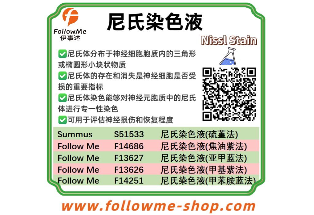 产品简介神经元细胞体包括一个具有皱褶核膜的大细胞核、稀疏的染色质和一个明显的核仁,在细胞体中细胞质是尼氏颗粒,即能够代表粗面内质网并在很多神经元中产生特异的斑点状嗜碱性表现的嗜碱性颗粒。尼氏颗粒可以用很多染色来显示如中性红、亚甲基蓝、甲苯胺蓝和甲基紫等,染色的变异、pH 和分化的时间使一些染色既可以仅突出尼氏物质,也可以显示神经元的细胞核和神经胶质。尼氏体(Nissl body)或称尼氏小体是分布于神经细胞胞质内的三角形或椭圆形小块状物质,能被碱性染料如硫堇、亚甲蓝、甲苯胺蓝和焦油紫等染料染成紫蓝色;各种神经细胞内都含有尼氏体,但其形状、数量、分布位置常常不同,尼氏体也存在于树突中,但不在于轴突和胞体的轴丘。尼氏体会因为生理状态的变化而变化,尼氏体是神经元内合成蛋白质的重要部位,当神经元受到刺激后,胞体内的尼氏体会明显减少。