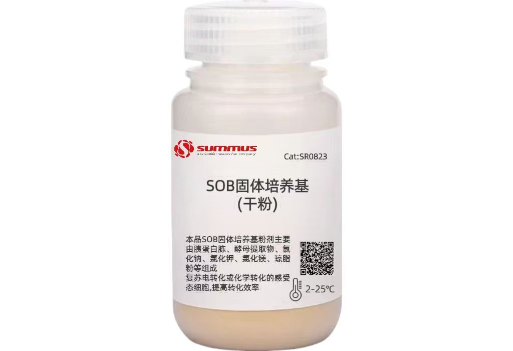 本品SOB固体培养基粉剂主要由胰蛋白胨、酵母提取物、氯化钠、氯化钾、氯化镁、琼脂粉等组成,其胰蛋白胨浓度比常规LB培养基高1倍,溶于无菌水,加热并制成固体平板;如果严格要求无菌,经15psi高压灭菌20min。该试剂仅用于科研领域,不适用于临床诊断或其他用途。