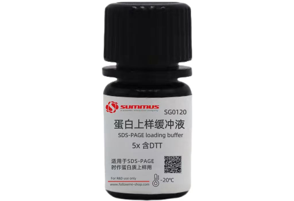 本品5x蛋白上样缓冲液(含DTT)即 SDS-PAGE Sample LoadingBuffer(5×,with DTT),是一种经过改良的以溴酚蓝为染料的 5 倍浓缩的蛋白上样缓冲液。本产品含少量 DTT,但不含有毒物质β-巯基乙醇,使蛋白上样操作相对安全健康。