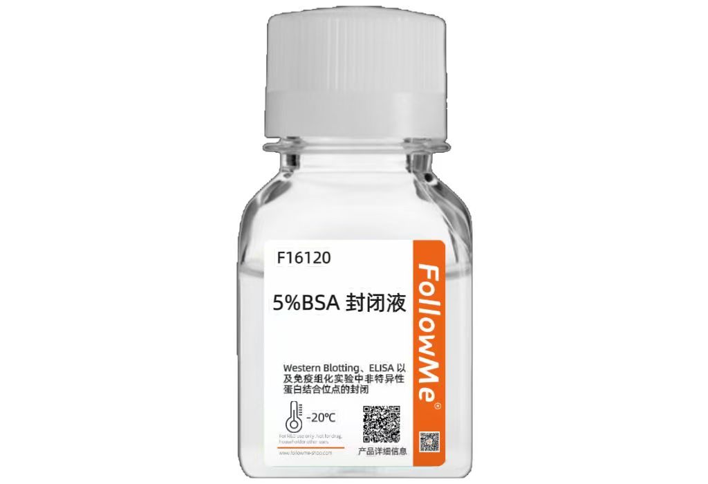 产品简介5%BSA 封闭液(Blocking Buffer)适用于 Western Blotting、ELISA 以及免疫组化实验中非特异性蛋白结合位点的封闭。封闭后,可以减小后续的一抗或二抗等和载体的非特异性结合,降低背景,增强信噪比,以达到理想的显色效果。