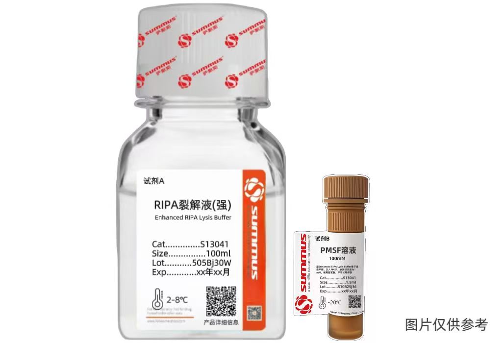 本品Enhanced RIPA Lysis Buffer 主要由 Tris 、NP-40、sodium deoxycholate等组成,并含有多种蛋白酶抑制剂成分,可以有效抑制蛋白的降解,并维持原有的蛋白间相互作用。该试剂仅用于科研领域,不适用于临床诊断或其他用途。