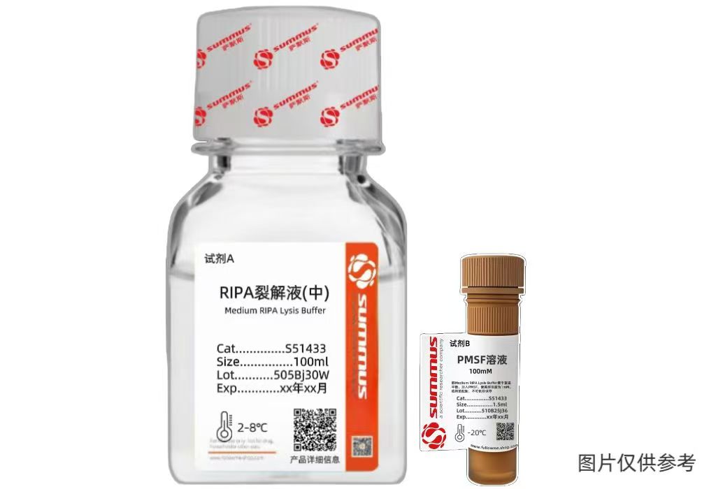操作步骤 (仅供参考)配制含有PMSF的Medium RIPA Lysis Buffer:取Medium RIPA Lysis Buffer置于室温平衡,加入PMSF,使其终浓度为1mM,临用前配制,不可长期保存。