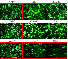 3. 培养基:经过 DMEM、RPMI-1640 和 M199 等常规培养基测试,推荐使用含5~10%牛血清的DMEM,若转染效果不理想可尝试其它培养基。