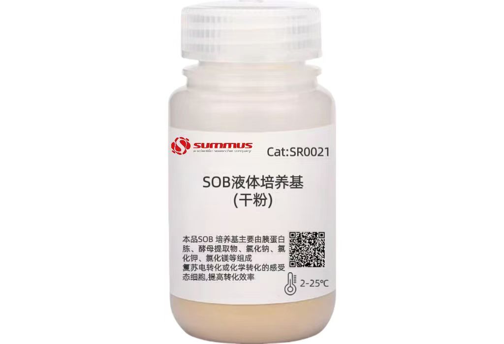 本品SOB 培养基主要由胰蛋白胨、酵母提取物、氯化钠、氯化钾、氯化镁等组成,其胰蛋白胨浓度比常规LB培养基高 1 倍,溶于无菌水即可使用;如果严格要求无菌,应高压灭菌20min。该试剂仅用于科研领域,不适用于临床诊断或其他用途。