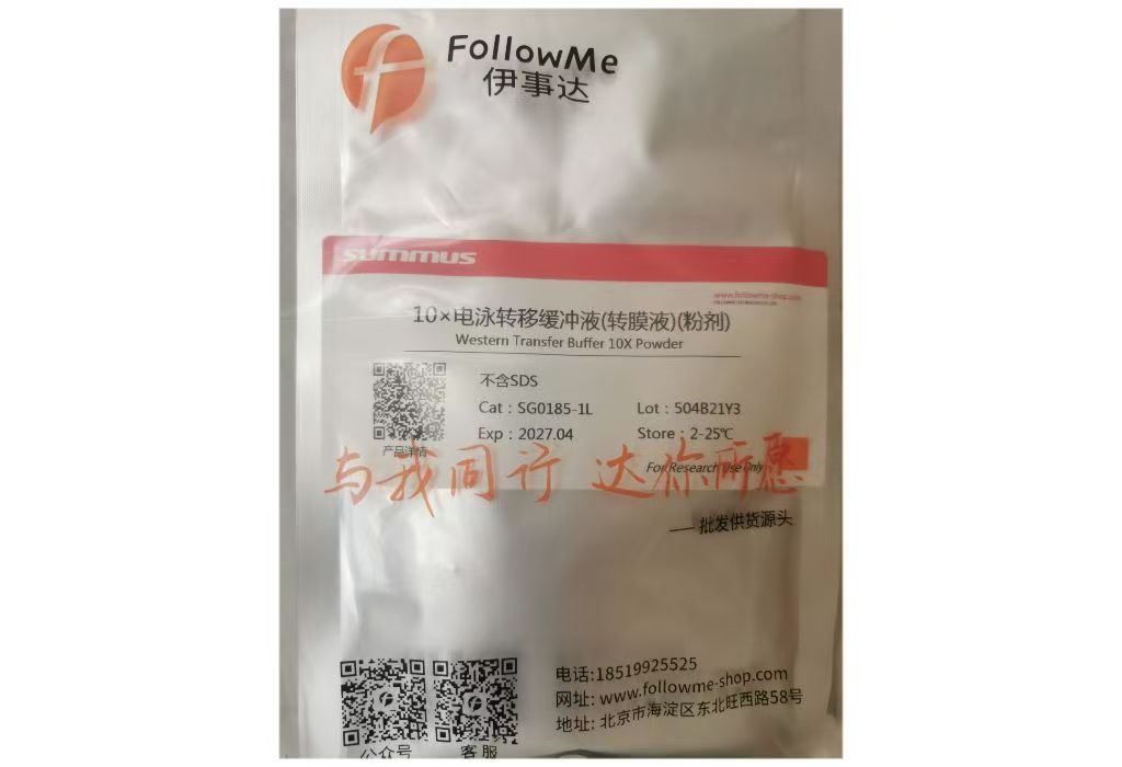 产品简介电泳转移缓冲液是用于蛋白印迹实验(Western blotting)中湿法以及半干法电泳转膜的缓冲试剂。本产品按常规方法配制而成,为预混粉末,不含SDS和甲醇,可配成10×电泳转移缓冲液,便于储存、操作简便。