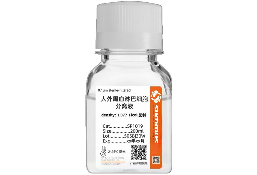 其分离原理是根据血细胞的密度差异(红细胞和粒细胞密度为 1.090 g/mL 左右;淋巴细胞和单核细胞密度为 1.075~1.090 g/mL;血小板为 1.030~1.035 g/mL),通过离心使一定密度的细胞按相应密度梯度分布,从而将淋巴细胞从人外周血或脐带血中分离出来。该产品仅用于科研领域,不适用于临床诊断或其他用途。