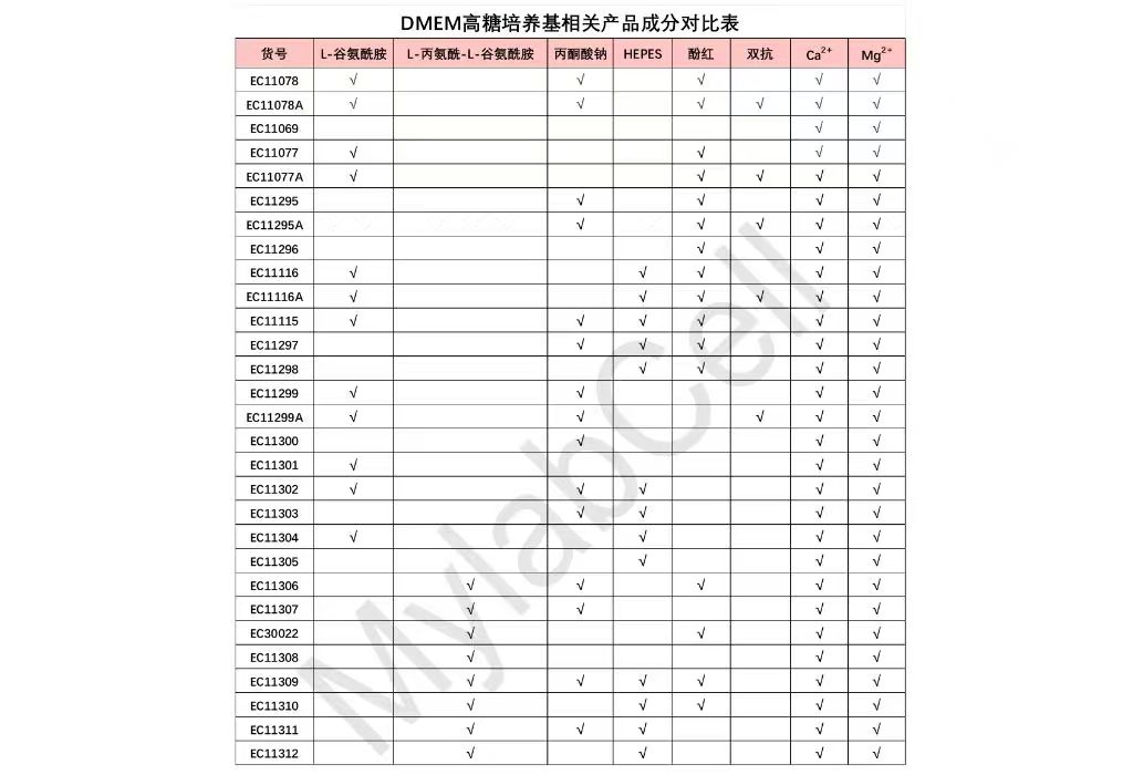 相关产品成分对比表 DMEM高糖培养基相关产品成分对比表