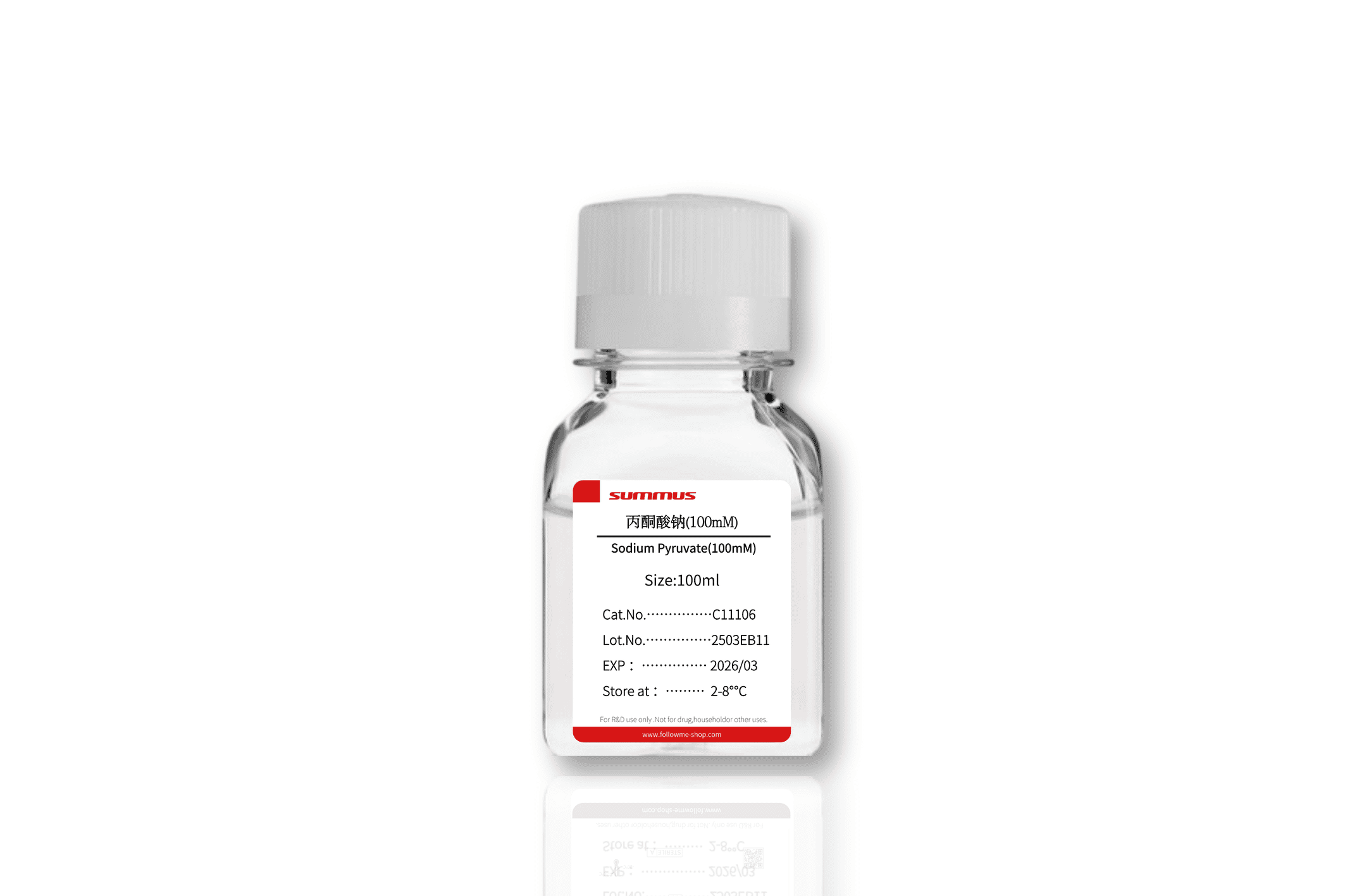 产品简介除了葡萄糖以外,丙酮酸钠通常还作为碳来源添加到细胞培养基中。由于细胞在糖酵解途径中将丙酮酸钠作为中间代谢物,因此它不是所有细胞培养所需要的添加剂。然而,如果细胞在补充了丙酮酸钠的培养基中生长,我们建议继续使用添加剂,因为无该添加剂时细胞生长可能会缓慢。丙酮酸钠(100mM)使用每升水11g配制。大多数细胞培养基中使用的丙酮酸钠的最终浓度为1mM。