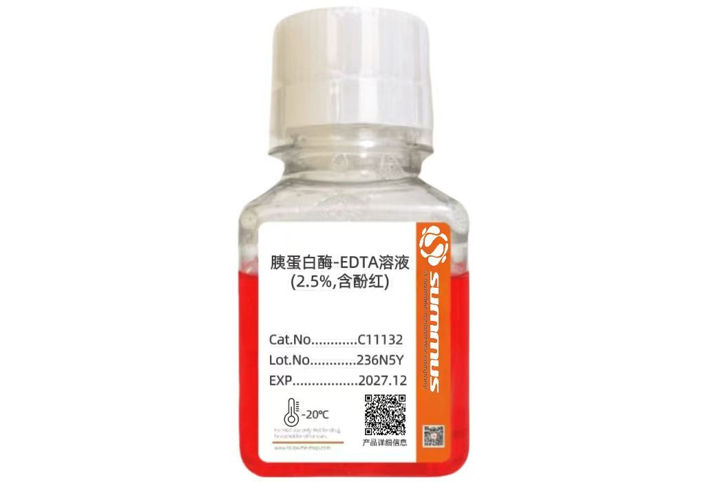 本品胰蛋白酶-EDTA消化液(Trypsin-EDTA Solution)含2.5%胰酶0.2% EDTA(5.3mM),溶于无钙镁平衡盐溶液中,经过滤除菌,可以直接用于培养细胞和组织的消化。本产品具有方便快速、稳定安全、细胞状态好等特点。通常室温消化 2 分钟左右就可以消化下大多数贴壁细胞。胰蛋白酶-EDTA 消化液有含酚红和不含酚红 2 类产品,酚红具有 pH 指示作用。