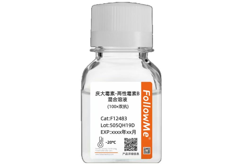 ■ 本品庆大霉素-两性霉素B混合溶液(100×双抗) ( Gentamycin-AmphotericinSolution, 100×)中含有25μg/ml两性霉素 B,用0.9%NaCl或PBS配制而成,经过滤除菌,可以直接添加到细胞培养液内用于细胞培养。按照100倍稀释使用即可;一个包装即100ml庆大霉素-两性霉素B混合溶液(100×双抗)可以配制10L细胞培养液。该试剂仅用于科研领域,不适用于临床诊断或其他用途。