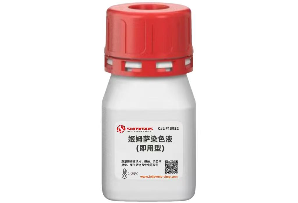 本品Giemsa Stain 以进口的姬姆萨色素、甲醇为主要原料,含特有衬染剂,经研磨配制而成,能呈现出清晰的细胞染色效果,常用于组织切片、血液和细胞涂片、细菌、染色体显带、原生动物寄生虫等染色。嗜酸性颗粒为碱性蛋白质,与酸性染料伊红结合,染粉红色,称为嗜酸性物质;细胞核蛋白和淋巴细胞胞浆为酸性,与碱性染料美蓝或天青结合,染紫蓝色,称为嗜碱性物质;中性颗粒呈等电状态与伊红和美蓝均可结合,染淡紫色,称为中性物质。该试剂仅用于科研领域,不适用于临床诊断或其他用途。