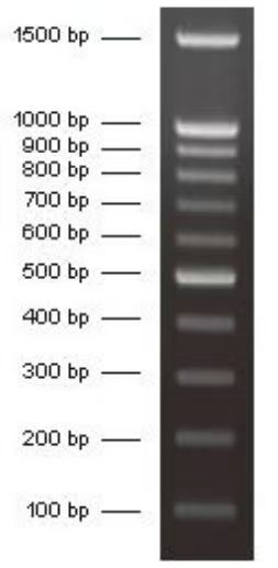 本产品的 11 条带分别为 100、200、300、400、500、600、700、800、900、1000 和 1500bp,上样 5μl 浓度分别为 50ng,40ng,30ng,40ng,100ng,60ng,70ng,80ng,90ng,100ng,50ng。